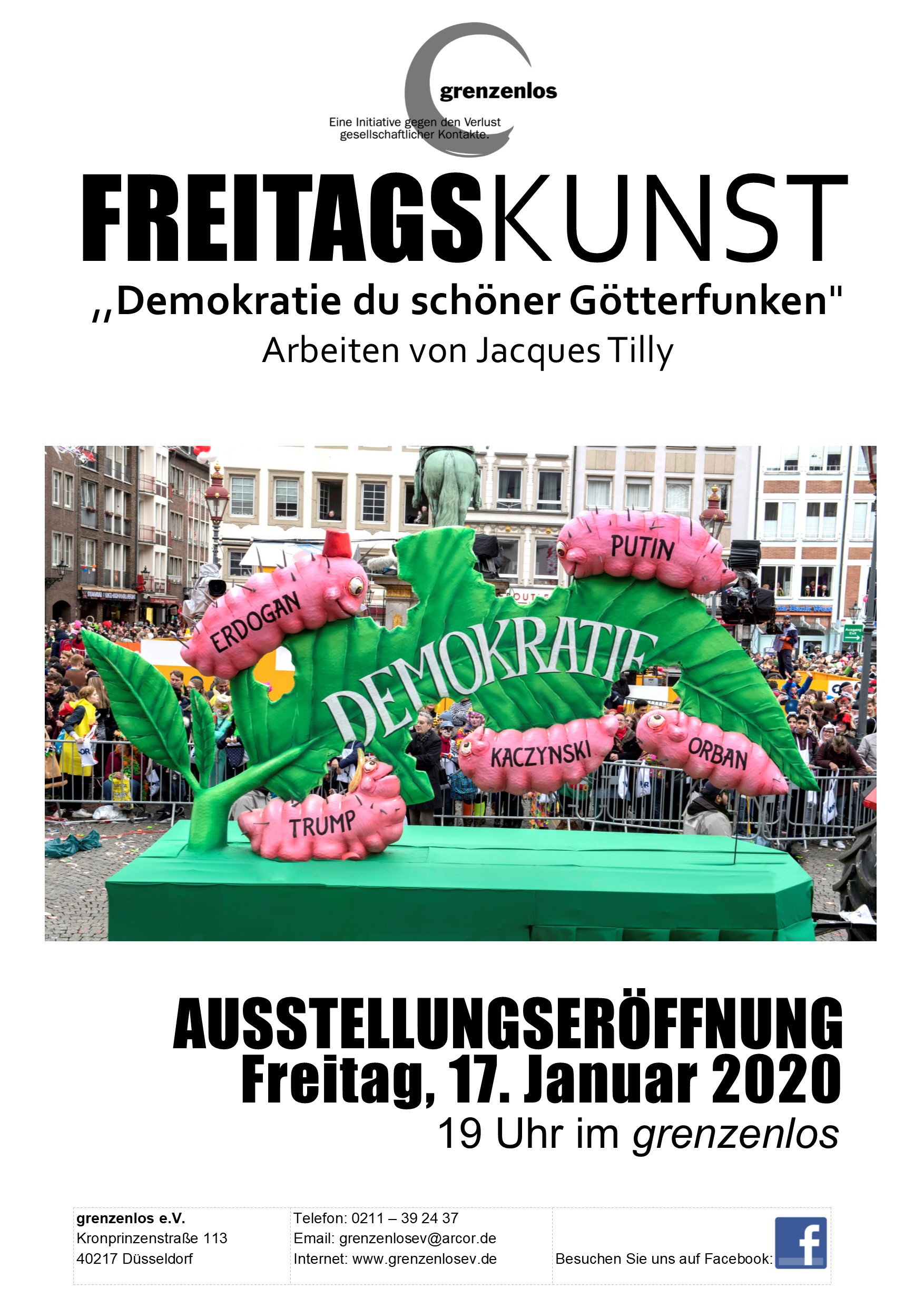 findet im Restaurant „grenzenlos“ in der Kronprinzenstraße 113 die Vernissage der Ausstellung „Demokratie du schöner Götterfunke“ des bekannten Düsseldorfer Künstler Jacques Tilly statt. Der Eintritt ist frei.