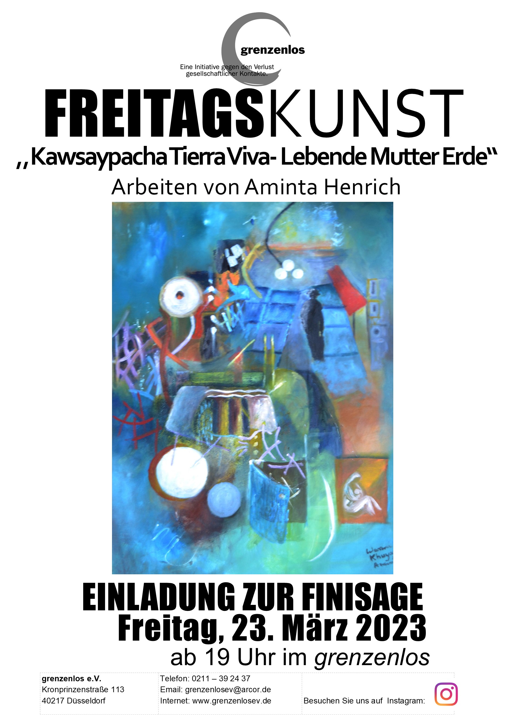 Freitag, den 24.03.2023, 19.00 Uhr Finissage “Kawsaypacha-Tierra viva- Lebende Mutter Erde“ von Aminta Henrich statt.